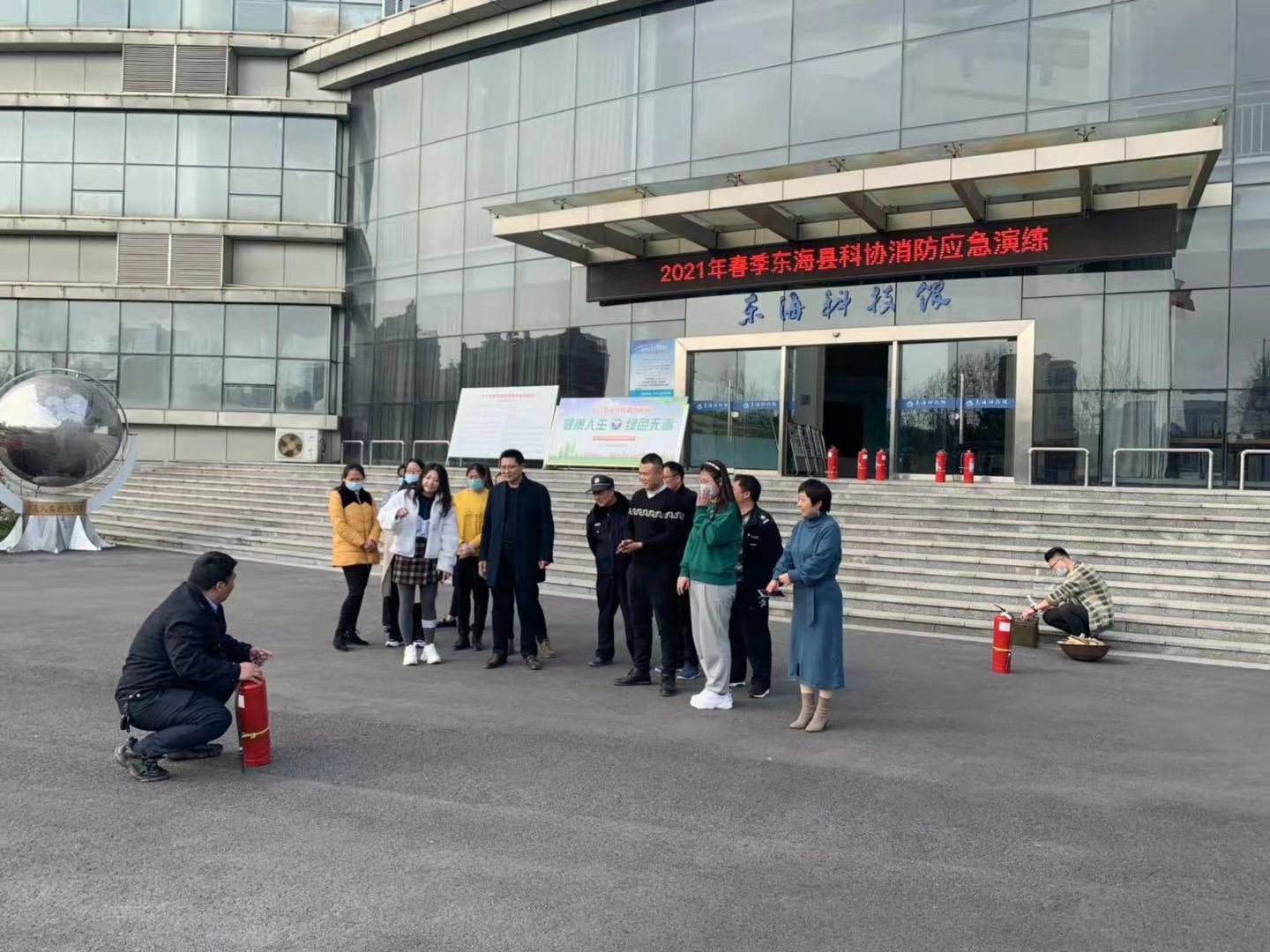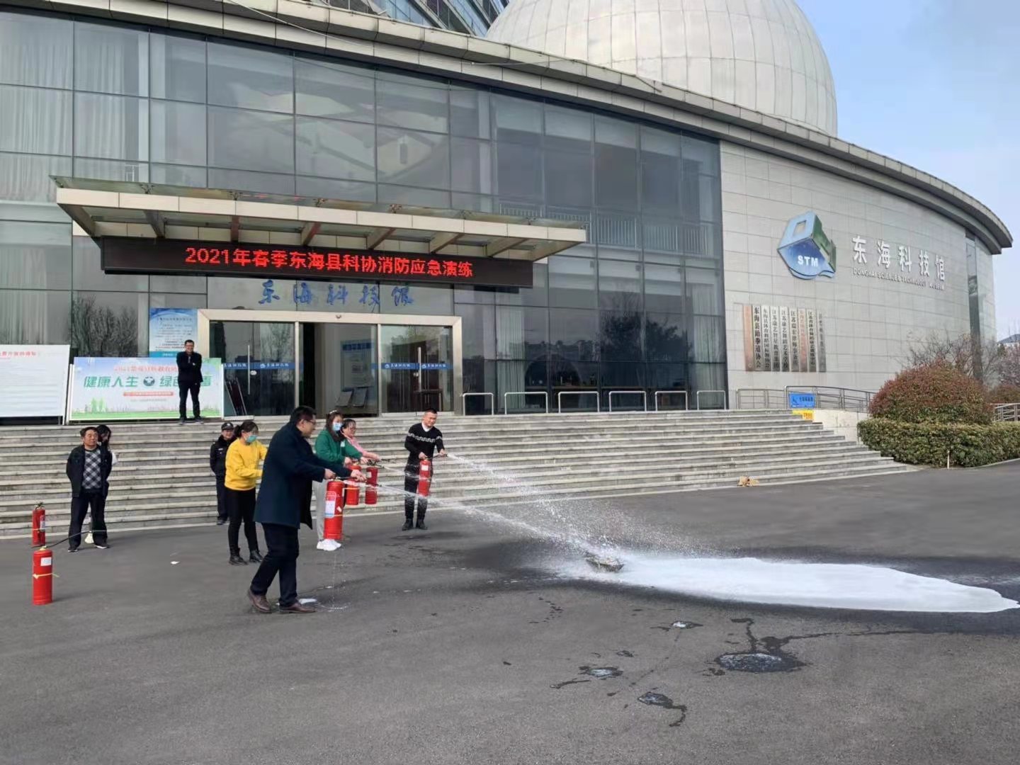 活动中,全体人员在专业人员的指导下,在科技馆门前广场开展了一次消防安全技能演练。按照科技馆《灭火和应急疏散预案》,进行了灭火器实操演练。