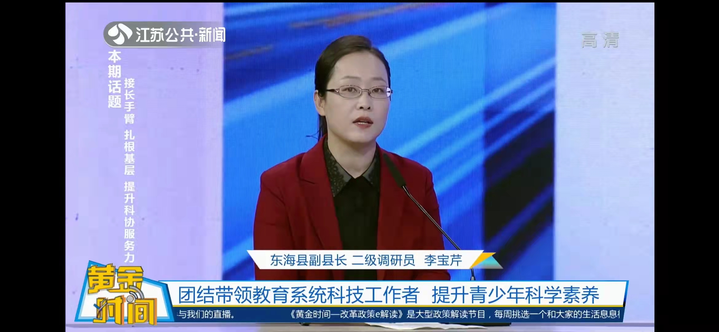 1月4日晚,由省委改革办与江苏公共·新闻频道联合策划的大型改革政策解读节目《黄金时间—改革政策e解读》播出《接长手臂 扎根基层 提升科协服务力》节目。东海县政府副县长、二级调研员李宝芹、东海县白塔埠镇中心小学校长周振程受邀就东海县“科协基层组织建设4+1改革试点”工作与主持人和现场观众互动交流。