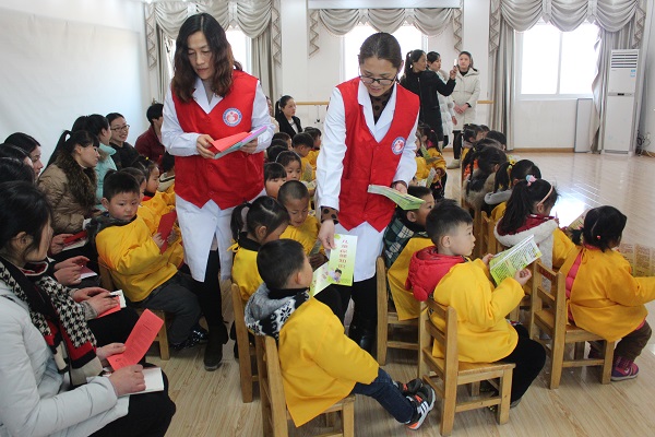 3月14日,赣榆区科协“心飞扬”志愿者服务队人员走进青口镇红旗幼儿园开展健康教育活动,活动的主题是“手足口病防治知识”宣传。
