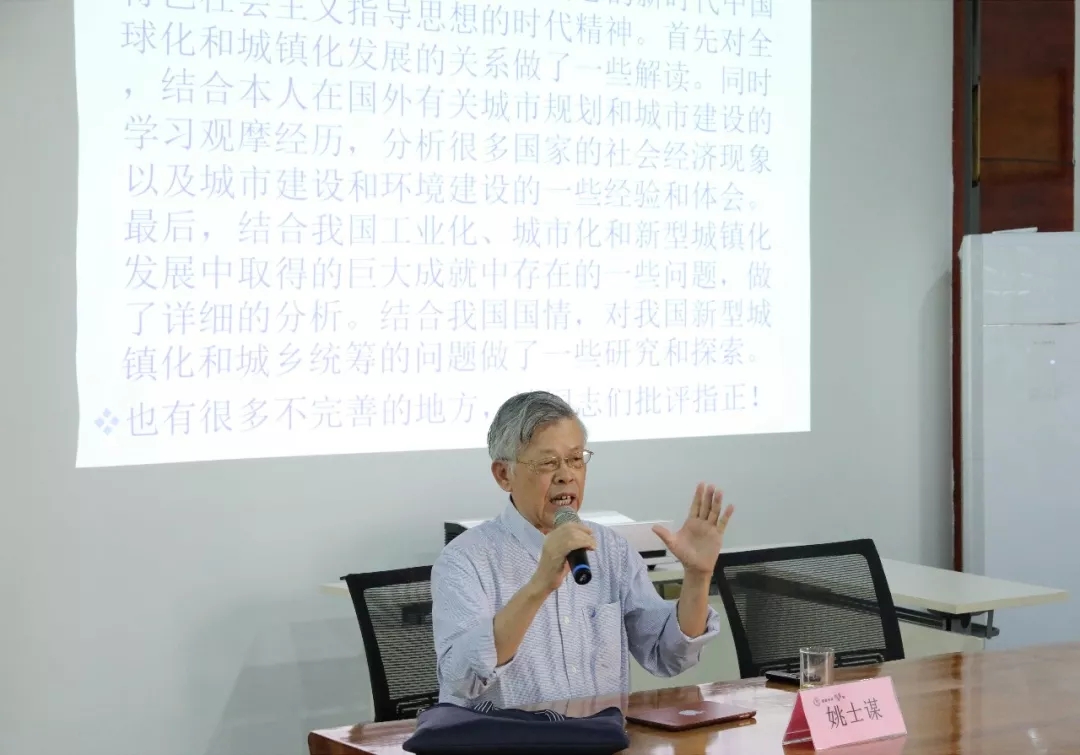 姚士谋教授先从全球化和城镇化发展关系及国外城市发展的类型和经验对工业化进程中生态环境对人类社会的影响等方面作了阐述,姚士谋教授着重讲了三点:一是我们要积极响应习近平主席的号召,要把“绿水青山就是金山银山”目标作为谋划发展的前提条件;二是强调科学技术为第一生产力,企业发展离不开科技创新更离不开人才;三是以“归家”为主题鼓励大家回乡创业,呼唤雁归本土发挥更大作用。另外在交流互动环节姚教授还和提出问题的朋友浅谈了当前由美国挑起的中美贸易战、当地企业吸纳人才的途径等问题。