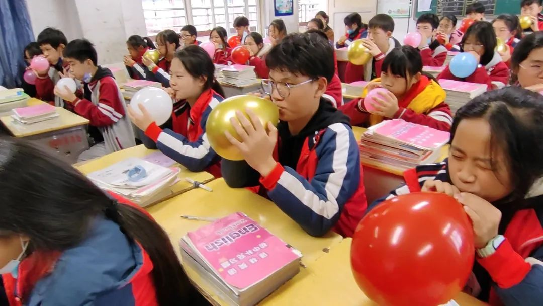课堂上还设计了传递乒乓球、吹气球、踩气球等释放压力的游戏。气球“噼噼啪啪”的爆炸声,夹杂着学生喊叫声,使整个班级的气氛顿时沸腾起来,压力与郁闷也在顷刻间得到了化解。