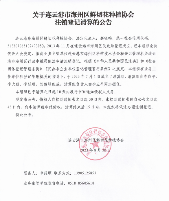 连云港市海州区鲜切花种植协会 (简化 )注销登记清算的公告及全体会员自行解散征询意见