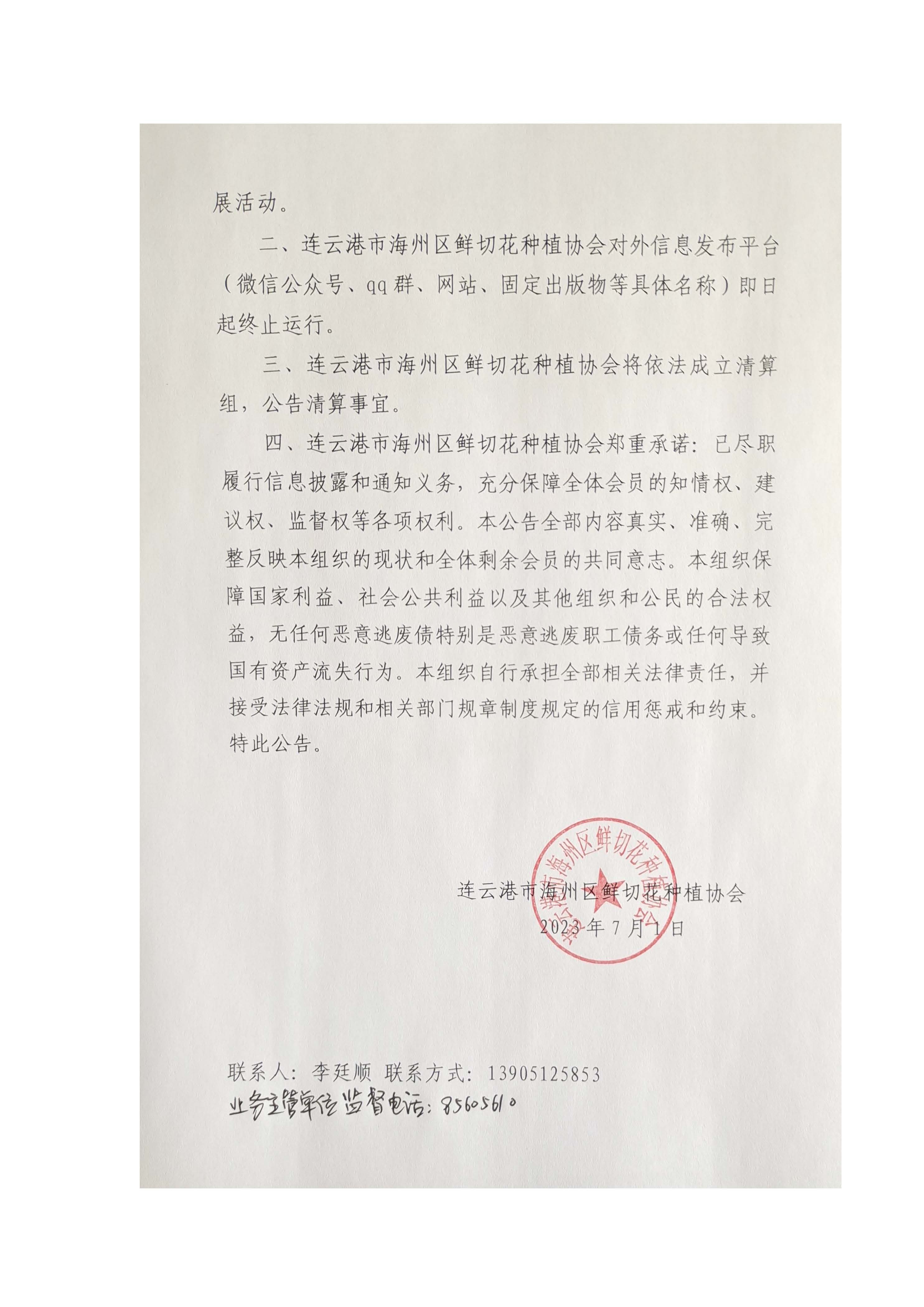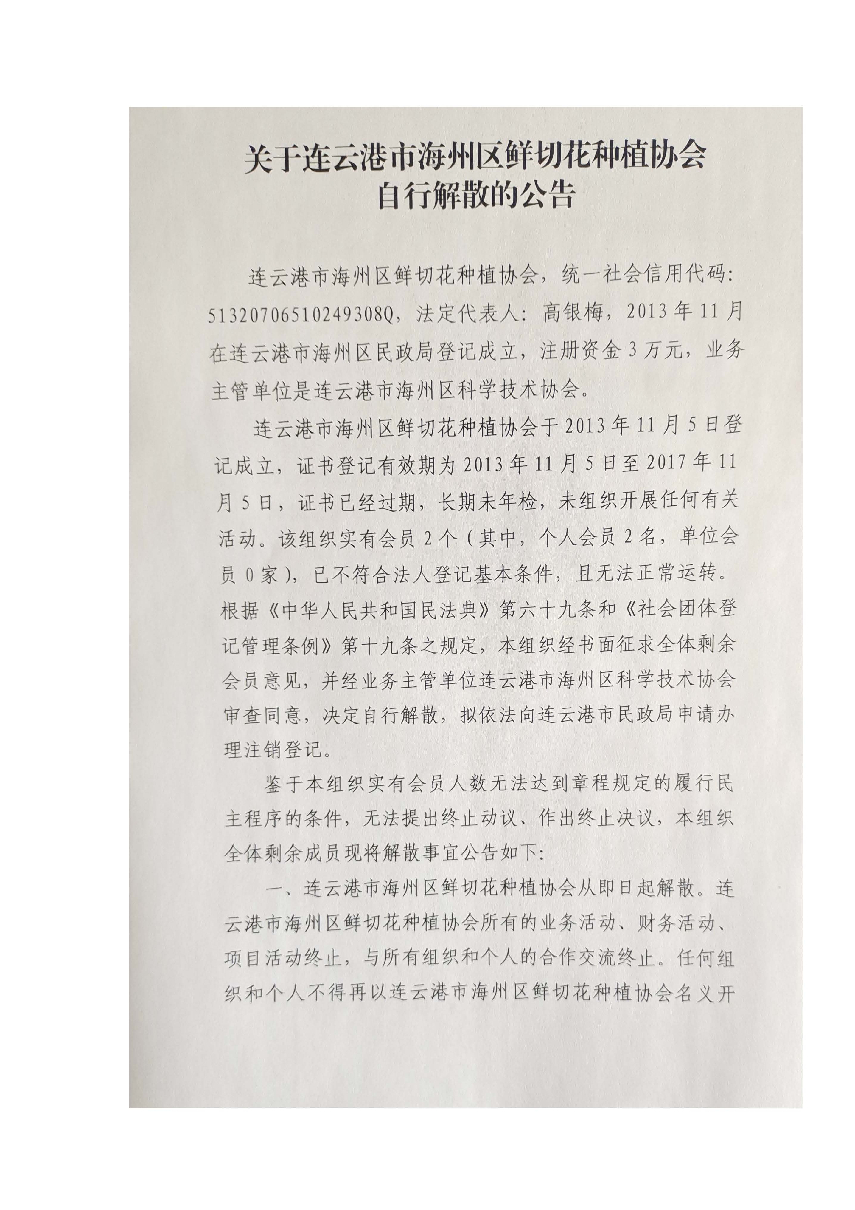连云港市海州区鲜切花种植协会自行解散的公告