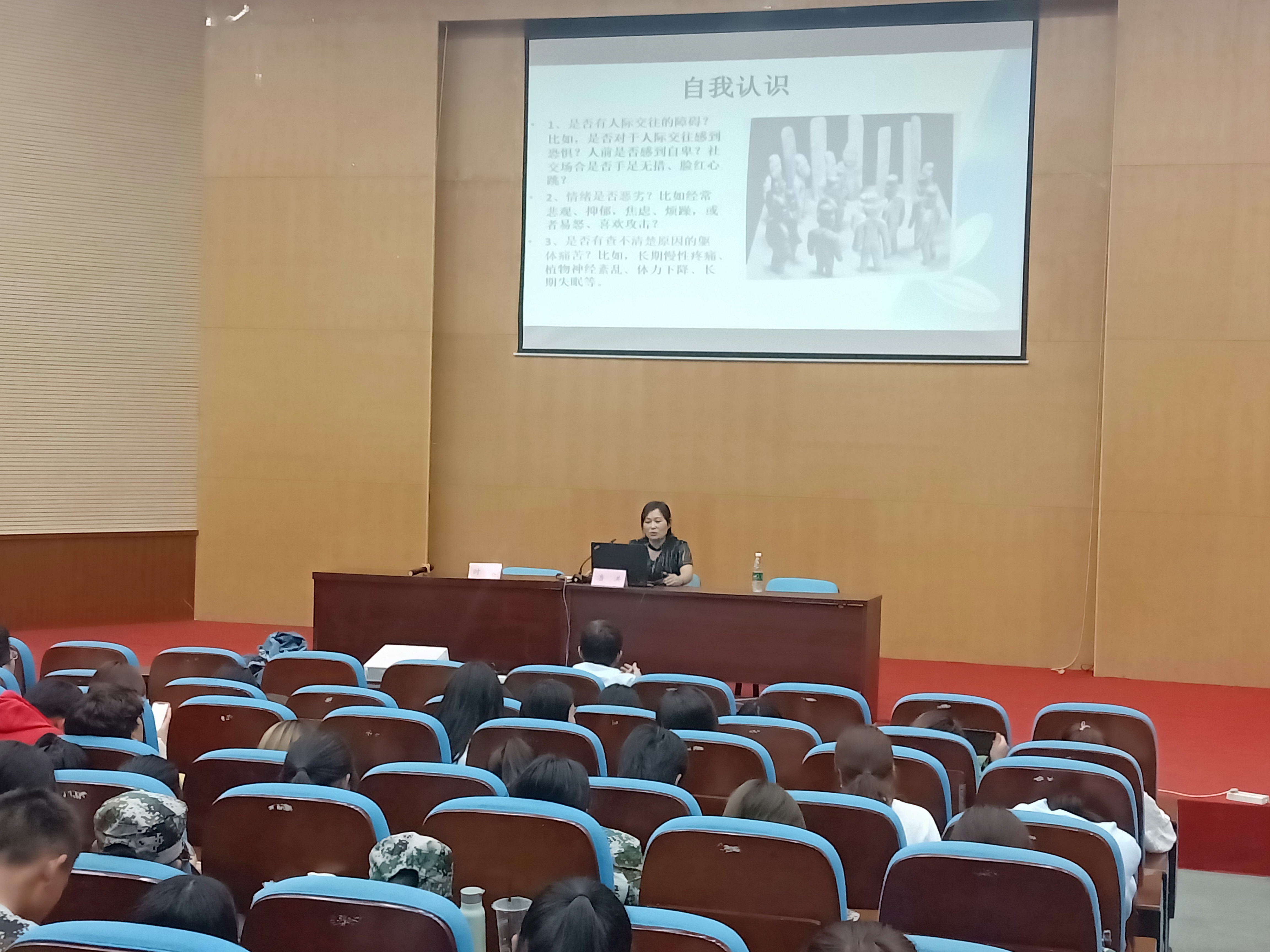 潘主任首先通过“心理健康知多少”的热身活动引出讲座的主题,说明当今大学生心理问题的严重性。接下来她结合大学寝室矛盾、残疾人励志故事等具体实例,从人际关系、学习问题、恋爱问题、情绪问题、网络成瘾、自我认识六大方面详细阐述了大学生常见心理问题的类型,同时告诉同学们一些情绪自我调节和缓解心理压力的方法。最后,潘主任对比了大学生活和中学生活的不同,为同学们更好适应大学生活提出相应的建议,并预祝同学们在大学阶段能完善自我,学业有成。