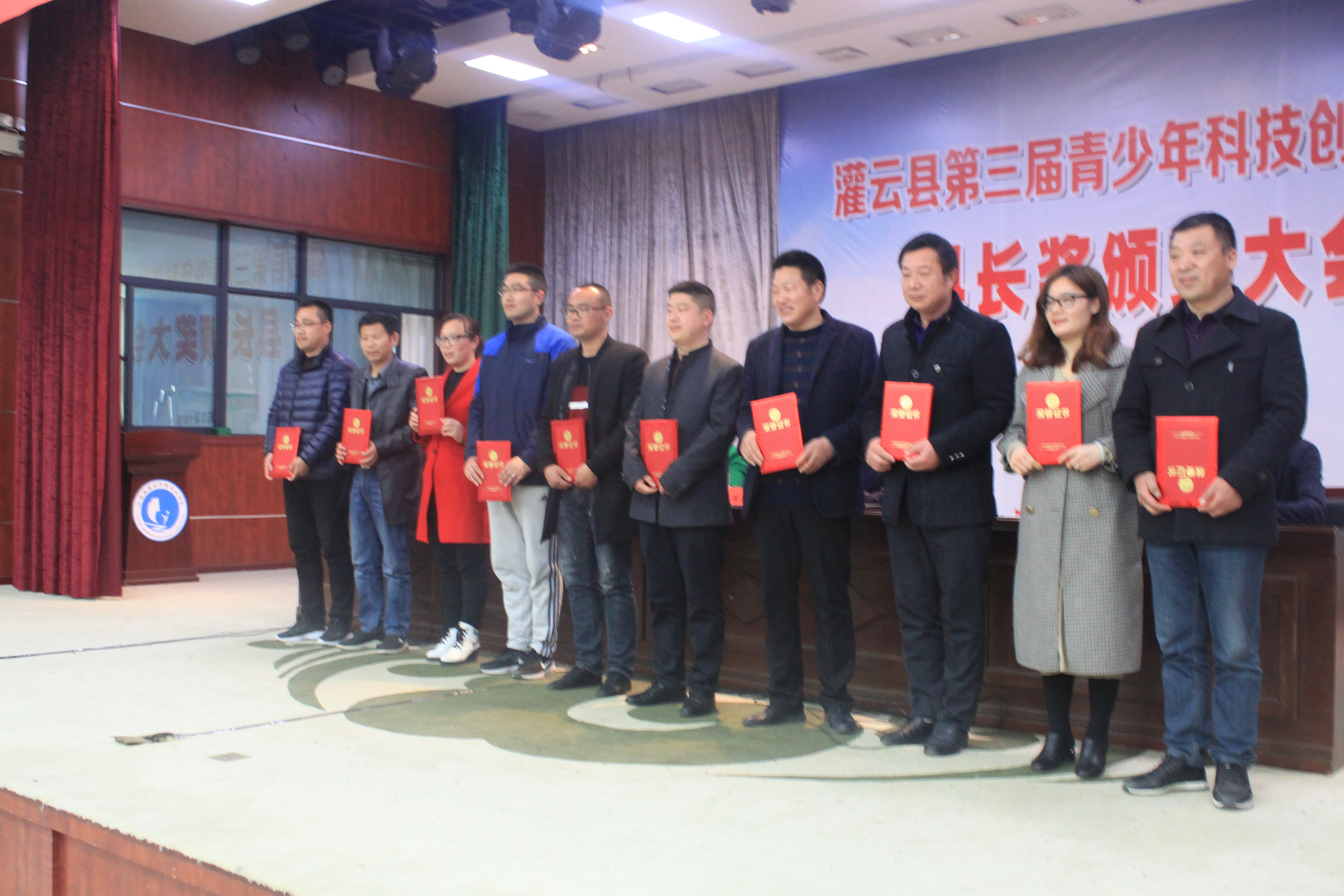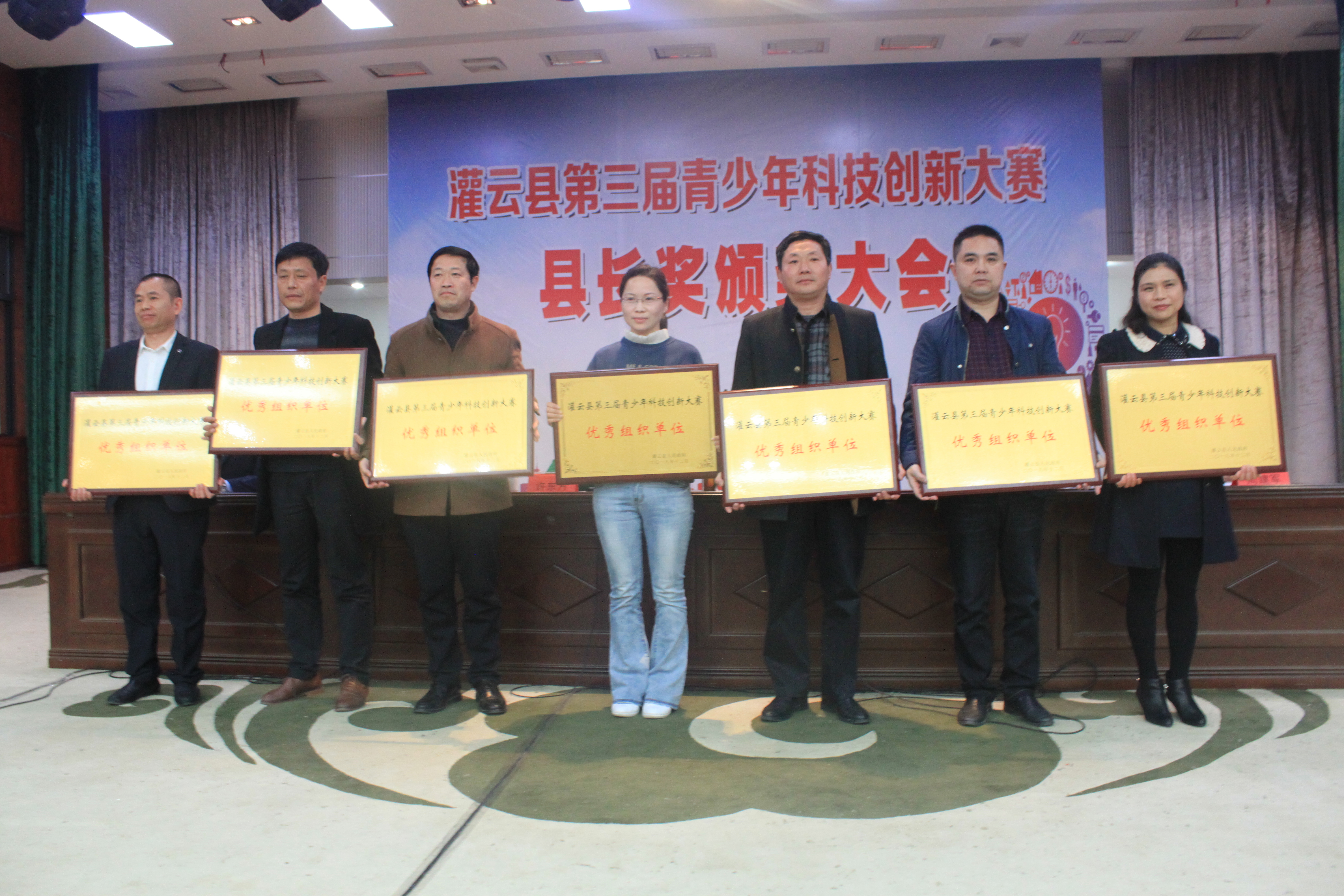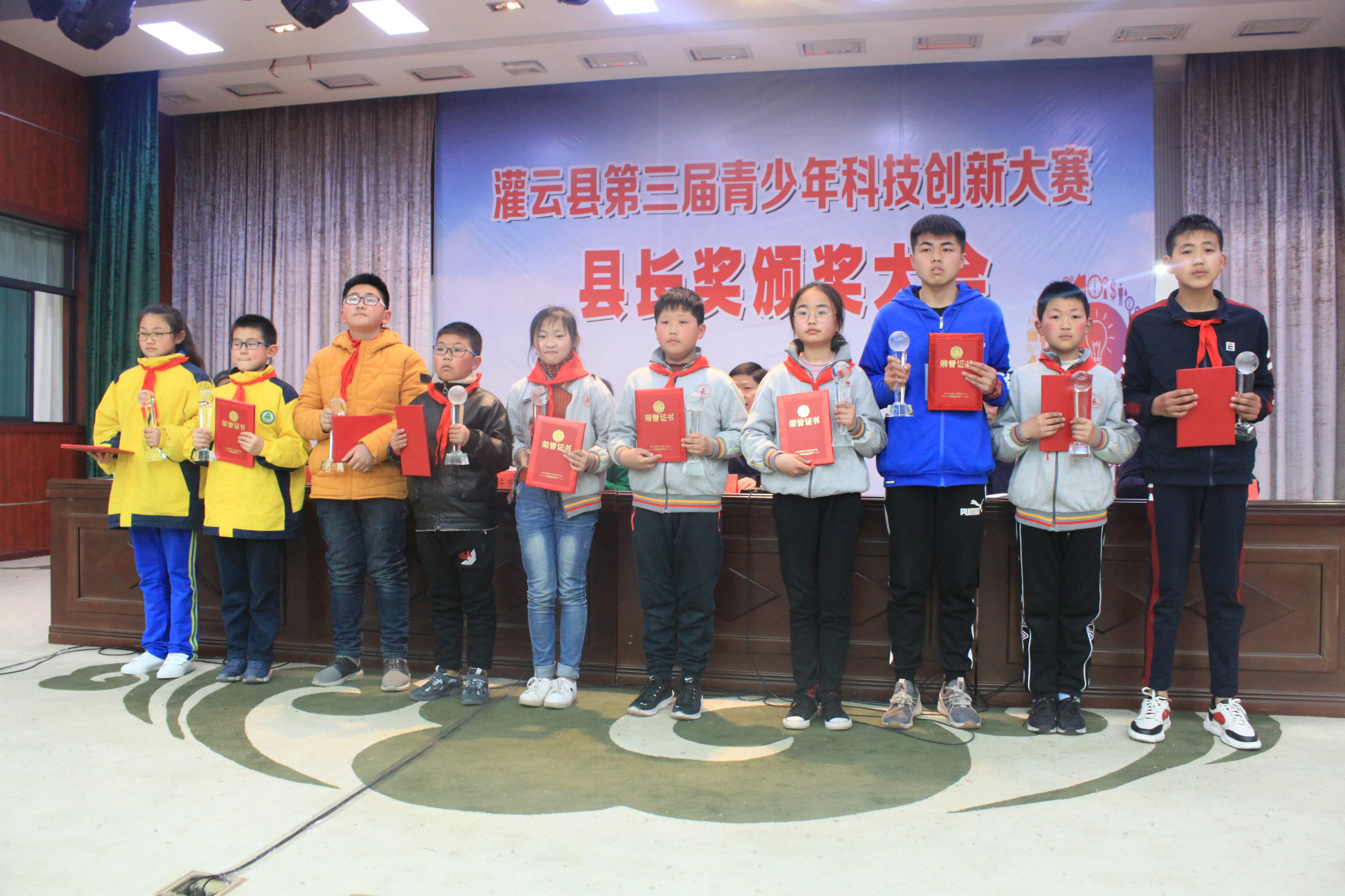 会上,宣读了表彰文件,各位领导为获得青少年科技创新县长奖各类奖项的学生、老师颁发证书和奖杯,并启动灌云县第四届青少年科技创新大赛县长奖评选活动。