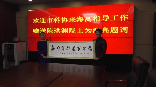 座谈会结束后,许东方将中国科学院院士、南京大学分析科学研究所和化学生物学研究所所长陈洪渊为海州高级中学题写的寄语交到周艳手中。陈洪渊院士题写“奋力前行追求卓越”祝福海州高级中学112年校庆,希望广大师生不断提高科学素质、科学思维、科学意识,为国家培养更多的优秀人才。