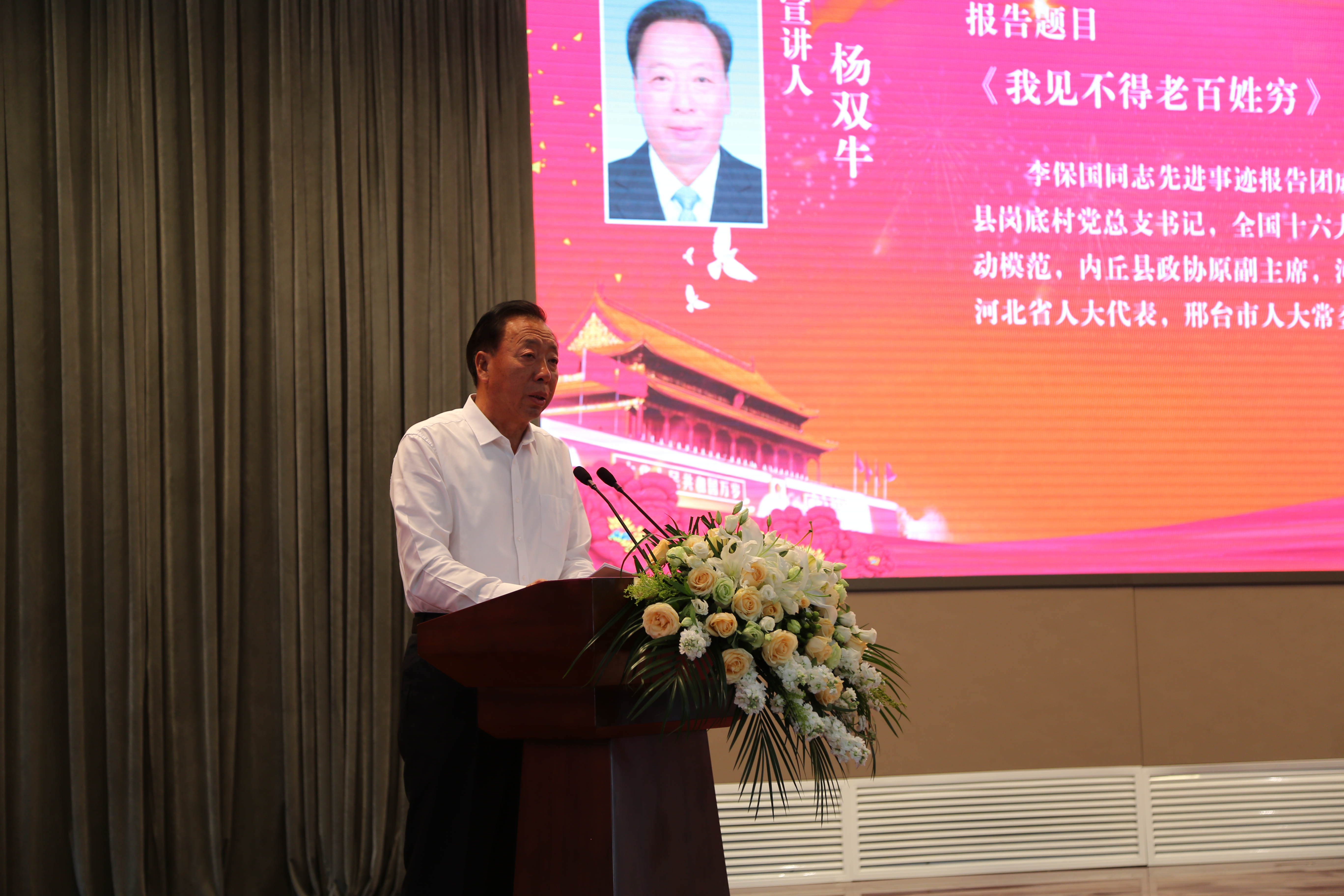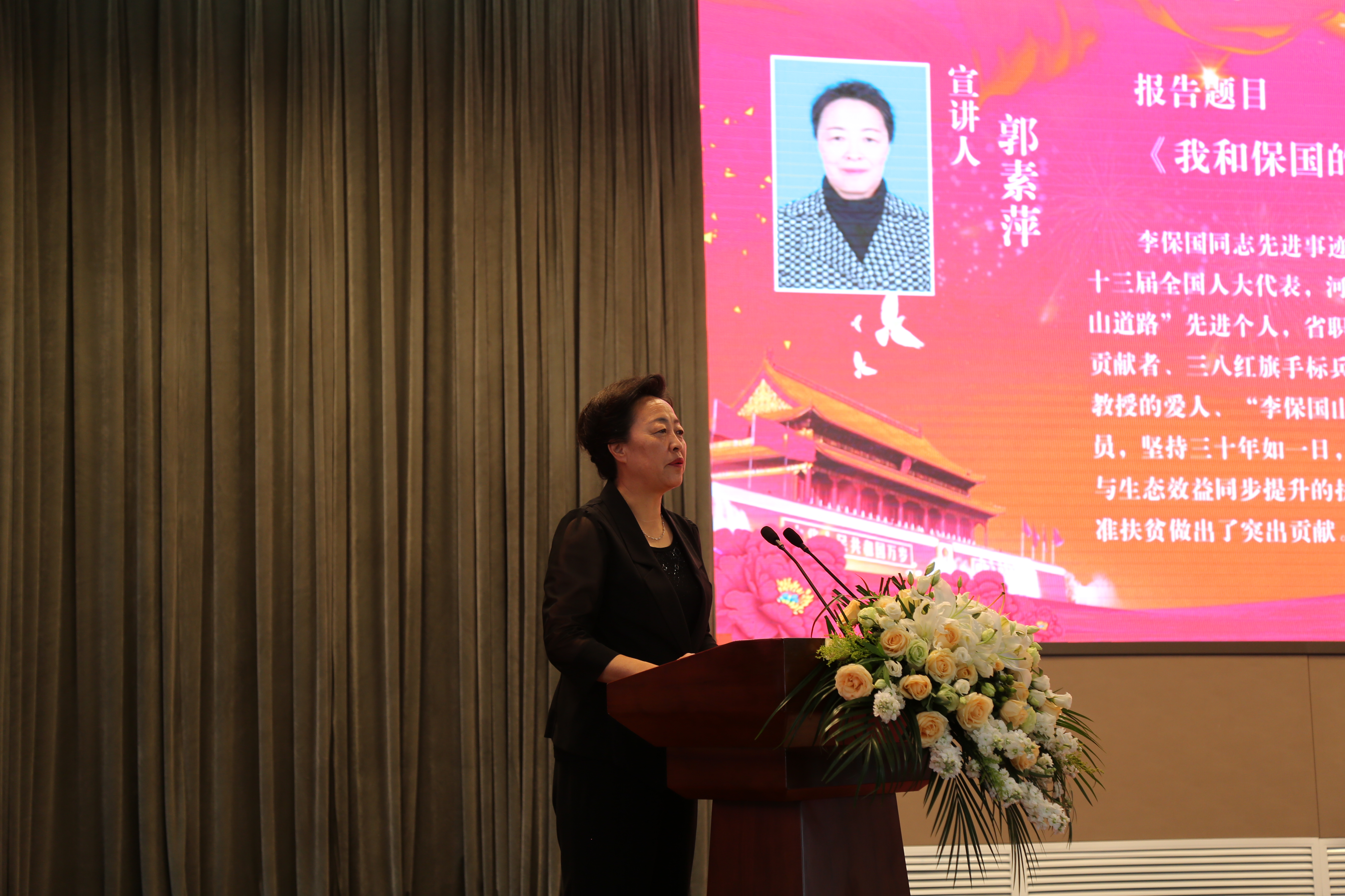 河北省内丘县岗底村党总支书记杨双牛,李保国老师的研究生陈利英,李保国老师的爱人、河北农大教授郭素萍,河北日报高级记者,河北日报邢台记者站原站长刘秀礼分别作了《我见不得老百姓穷》、《我的严师慈父》、《我和保国的三个家》和《太行山上的新愚公》四个主题报告。四位报告人从不同的角度讲述了李保国同志的先进事迹和崇高精神,真实再现了李保国同志充分心系群众、扎实苦干、奋发作为和无私奉献的一生。作为太行山的儿子,他带领山区农民脱贫致富,生前身后受到无数群众的赞扬和追怀;作为老师,他言传身教,是严师亦是慈父;作为科研人员,他毕生致力于山区开发技术的研究和推广,理论成果与实用技术硕果累累。报告不时被掌声打断,在场人员对李保国“艰苦奋斗、甘于奉献、求真务实、爱国为民”的太行山精神充满感佩。