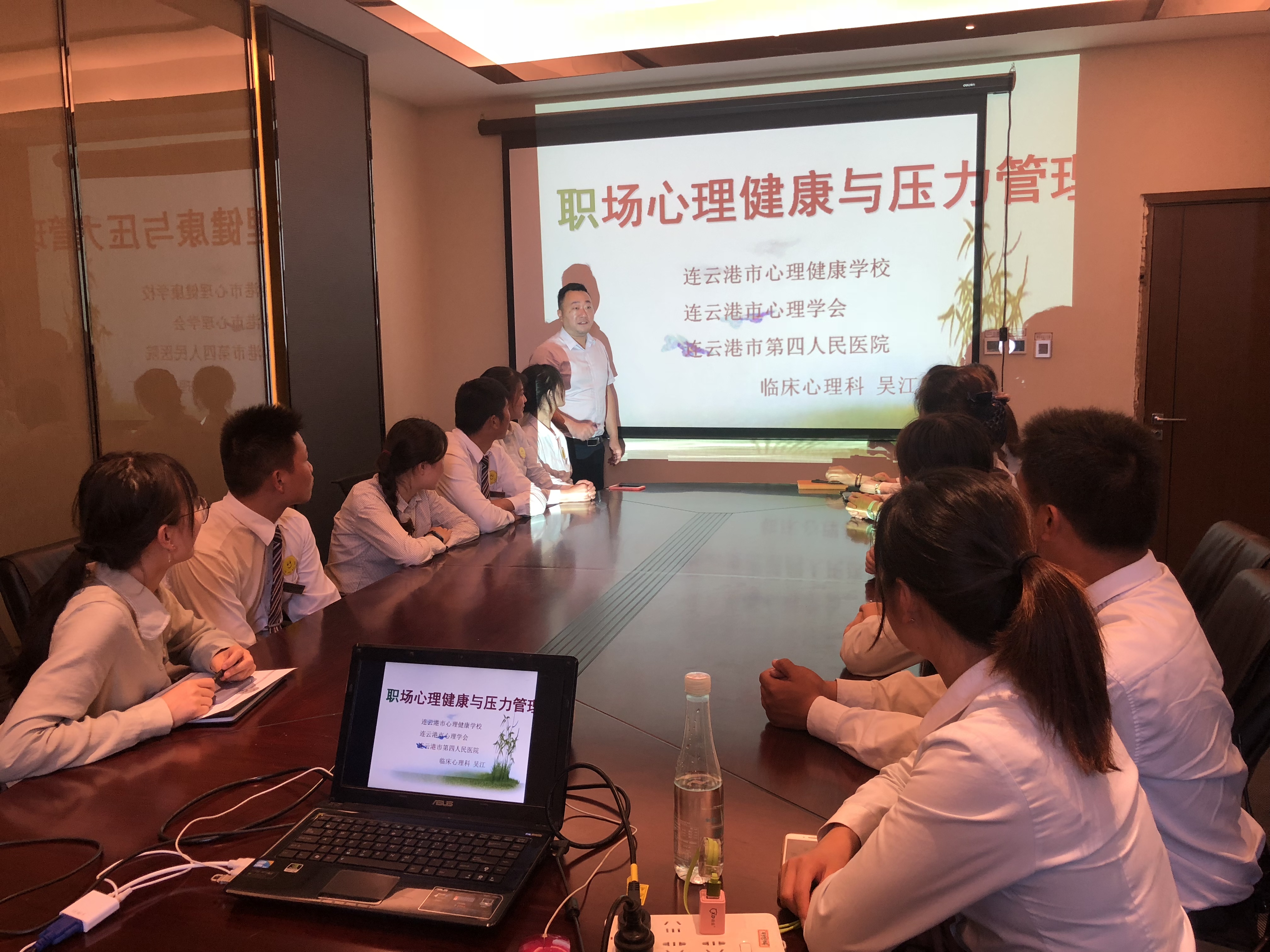 9月26日,由连云港市卫生健康委员会、连云港市健康城市建设指挥部办公室、连云港报业传媒集团有限公司主办,市心理学会协办,连云港市民心理健康学校、连云港市第四人民医院承办的迎祖国七十华诞心理健康“四进”活动在恒大林溪郡举行,市四院临床心理科副主任吴江医生为该单位二十余名员工开展了题为“职场心理健康与压力管理”的主题讲座。