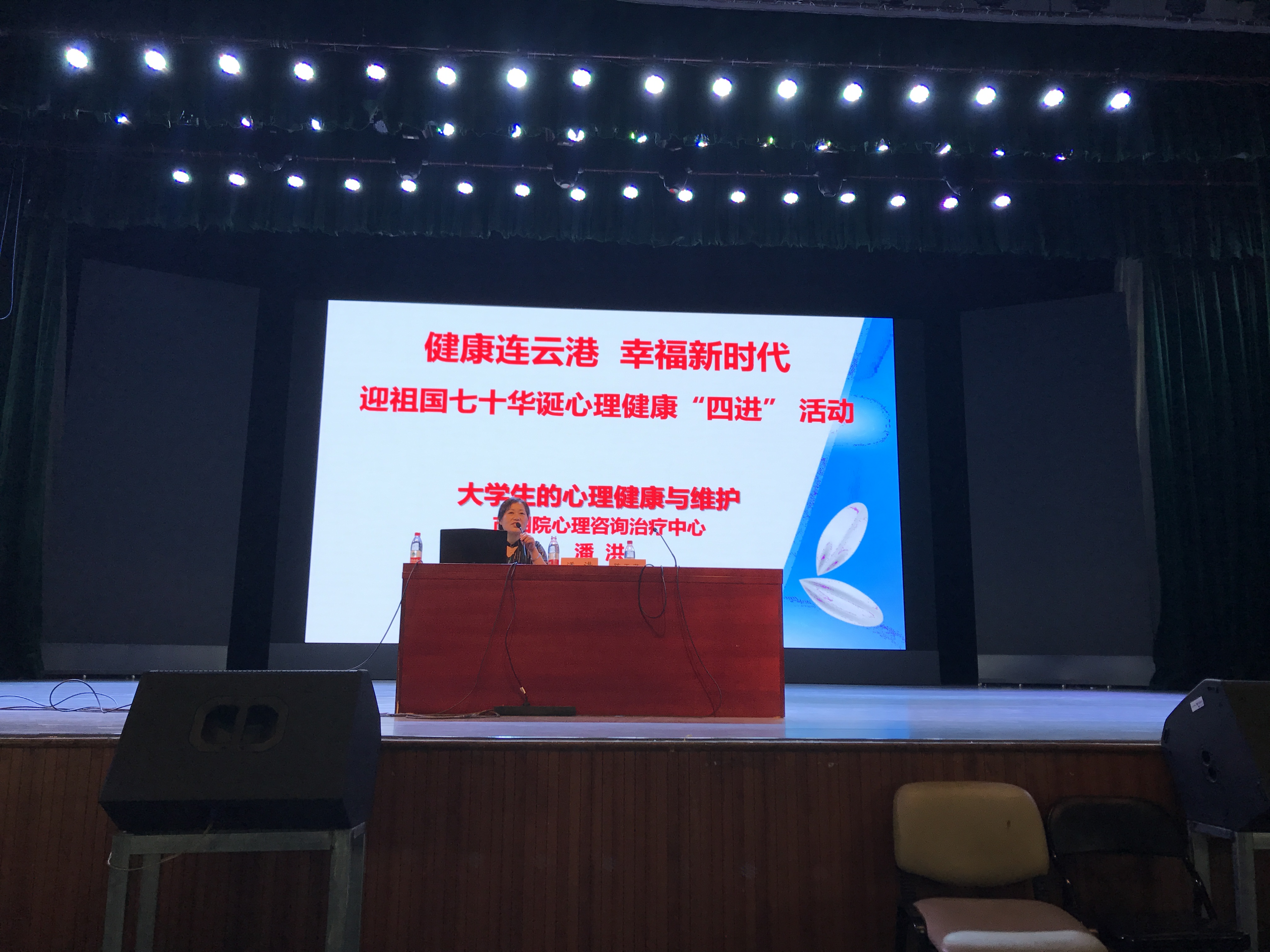 9月25日下午,由连云港市卫生健康委员会主办,市心理学会协办,连云港市民心理健康学校、连云港市第四人民医院承办的迎祖国七十华诞心理健康“四进”活动在江苏海洋大学举行,连云港市第四人民医院心理咨询治疗中心的潘洪主任为1000多名大学生开展了主题为“大学生的心理健康与维护”的心理健康讲座。