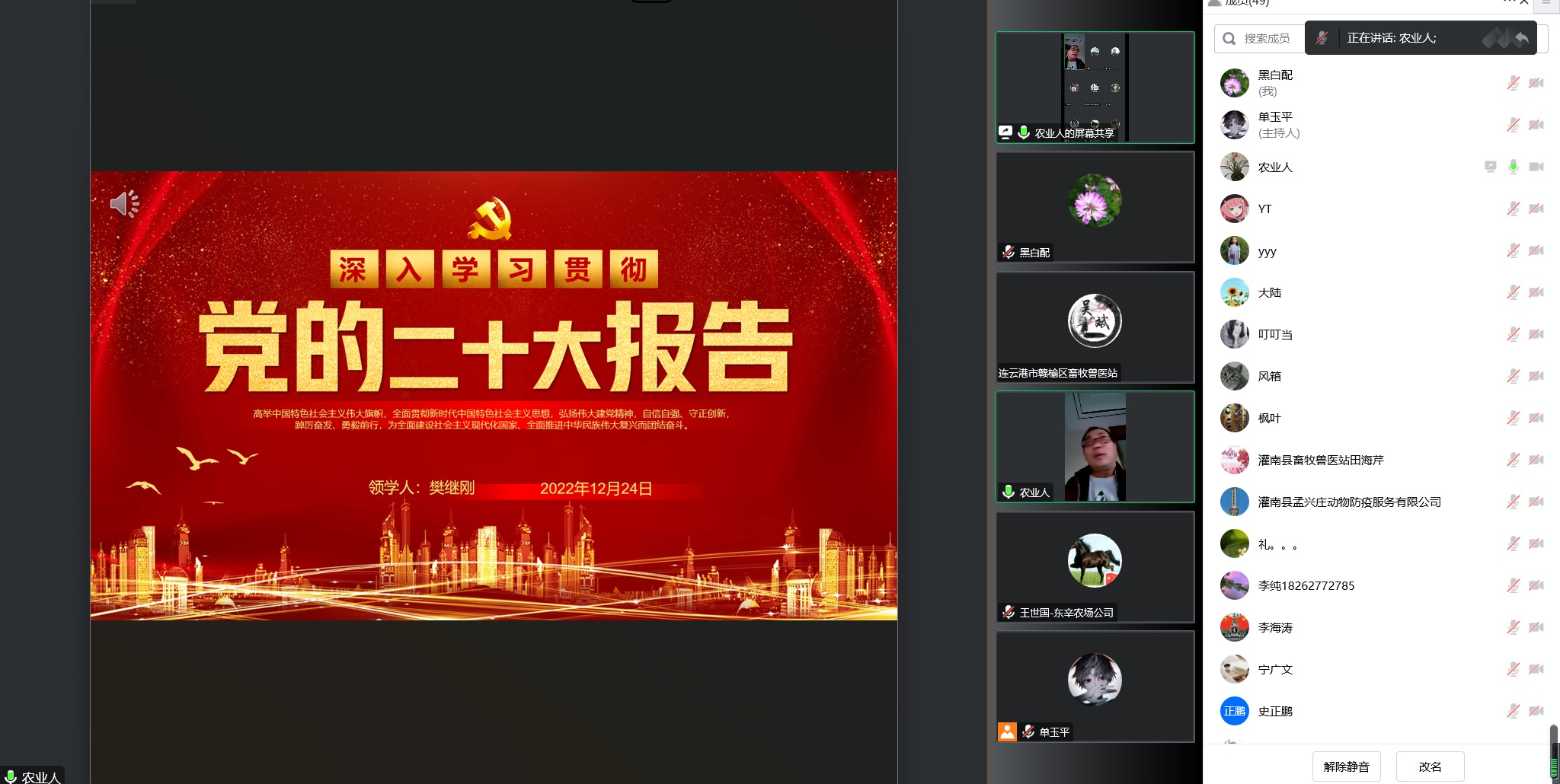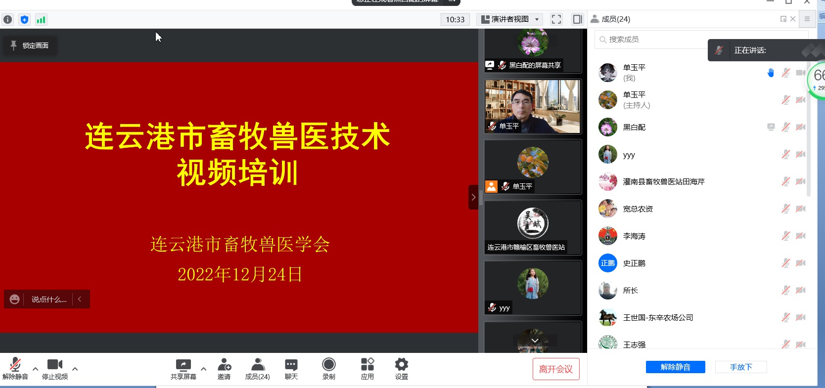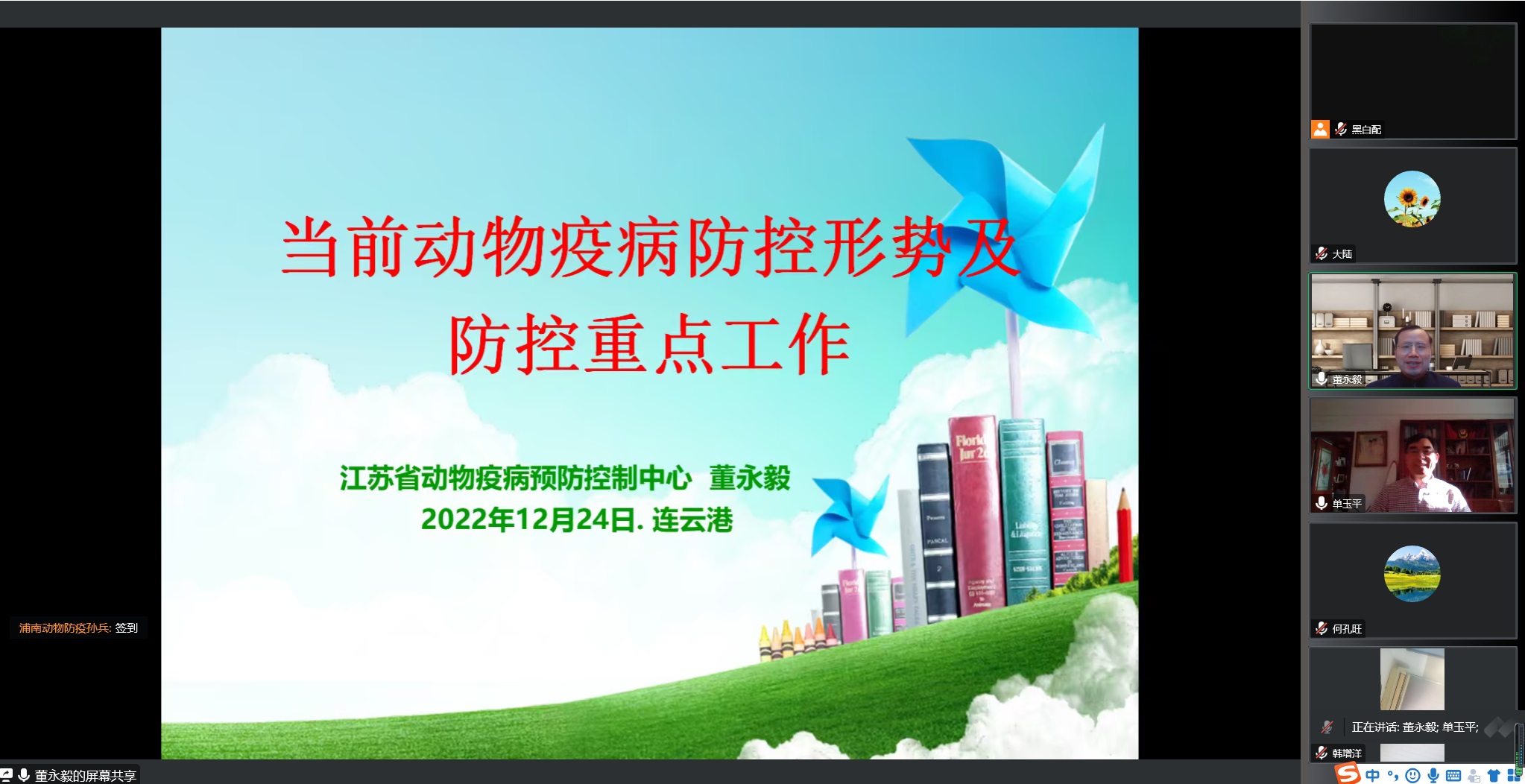 为进一步宣传贯彻落实党的二十大会议精神,推进兽用抗菌药使用减量化行动、非洲猪瘟等重大动物疫病防控工作,有效遏制动物源细菌耐药,全面提升畜禽绿色健康养殖水平,维护畜牧业生产安全、动物源性食品安全、公共卫生安全,提升广大畜牧兽医工作人员业务能力,促进畜牧业高质量发展。近日,市畜牧兽医学会举办了为期一天的全市畜牧兽医技术视频培训班,本次培训班采取线上教学方式,市、县、区、乡畜牧兽医技术骨干、养殖企业、动物防疫社会化服务公司负责人等100余人参加了培训。