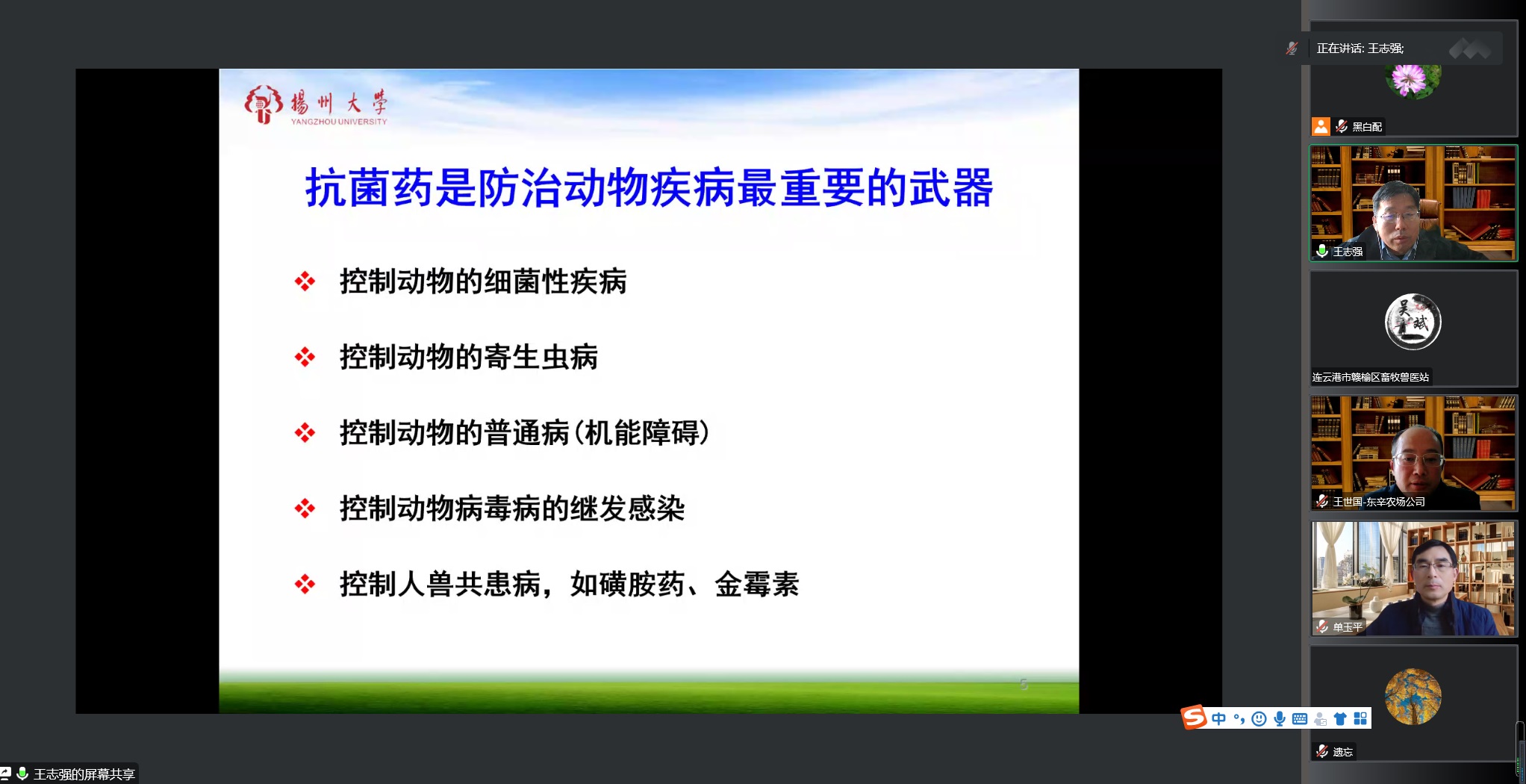 王志强教授在他的《减抗背景下养殖场合理用药》授课报告中,还和大家分析了当前我国兽用抗菌药的应用情况、介绍了抗菌药使用的相关最新政策、列举了临床常见的不合理用药的主要表现,并从构建生物安全体系,及时正确诊断,明确适应症,精准用药,控制剂量疗程、优化给药方法、加强综合治疗等7个方面对养殖场如何合理用药提出了很好的指导意见。最后他指出正确选择和科学精准使用抗菌药只是减抗的一部分,而做好生物安全,减低环境的感染压力是提高养殖效率,减少抗菌药使用的根本。