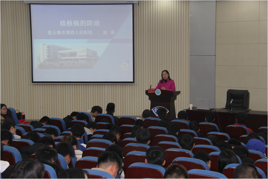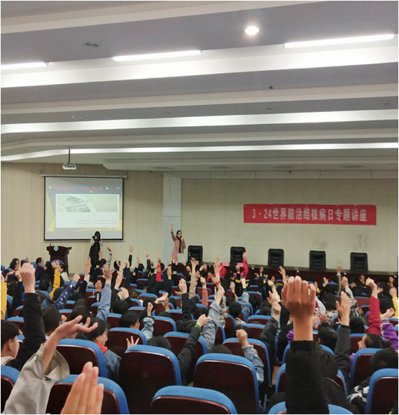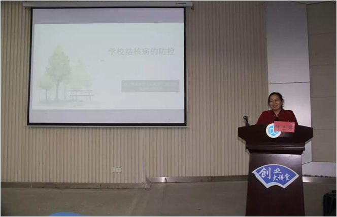 首先由结核病专家赵丽主任医师讲课,课题为《结核病的防治》,她通过形象直观的图片和通俗易懂的语言重点介绍了结核病的特点、传染模式等内容。让学生们学到了结核病防治知识,也提高了大家对结核防治的认识程度。