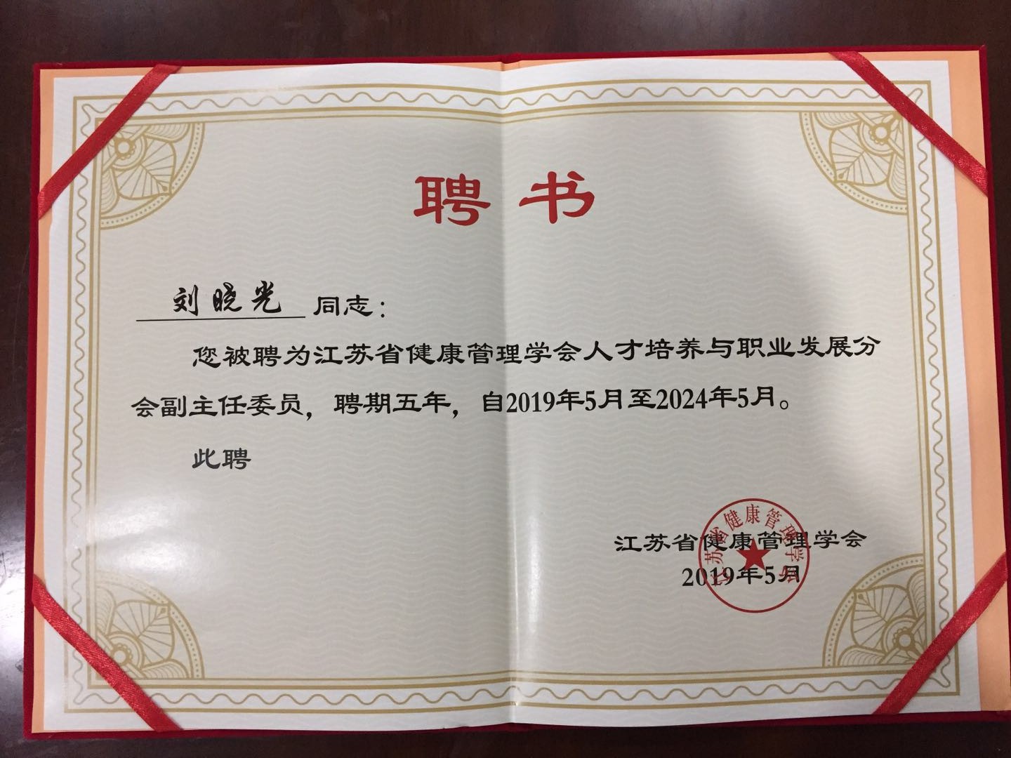 2019年5月,连云港市保健协会被聘请为江苏省健康管理学会——人才培养与职业发展分会副主任委员单位,会长刘晓光被聘请为江苏省健康管理学会——人才培养与职业发展分会副主任委员。