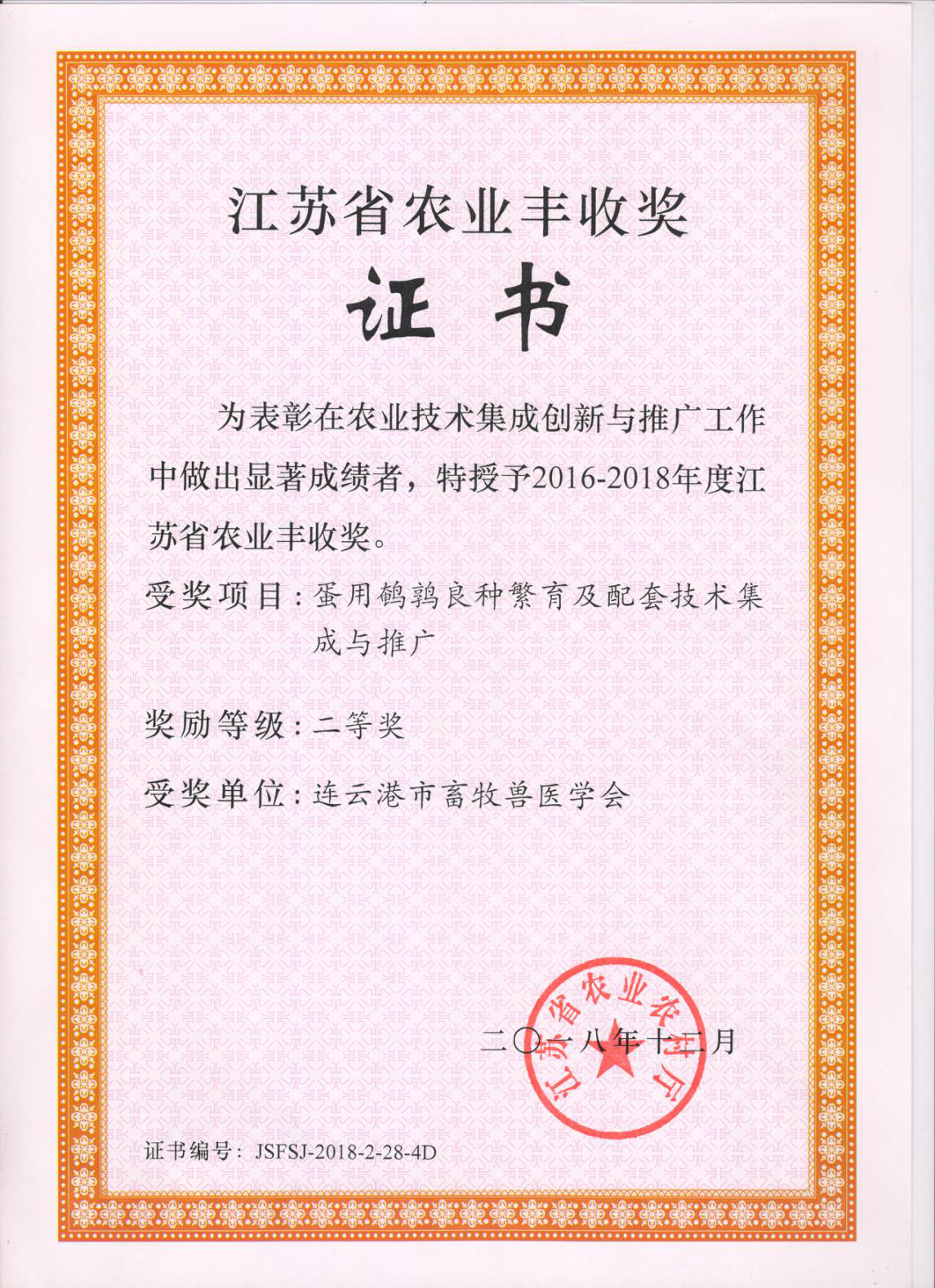 我会副理事长张孝庆主持的《蛋用鹌鹑良种繁育及配套技术集成与推广》项目荣获2016-2018年度江苏省农业丰收奖二等奖。