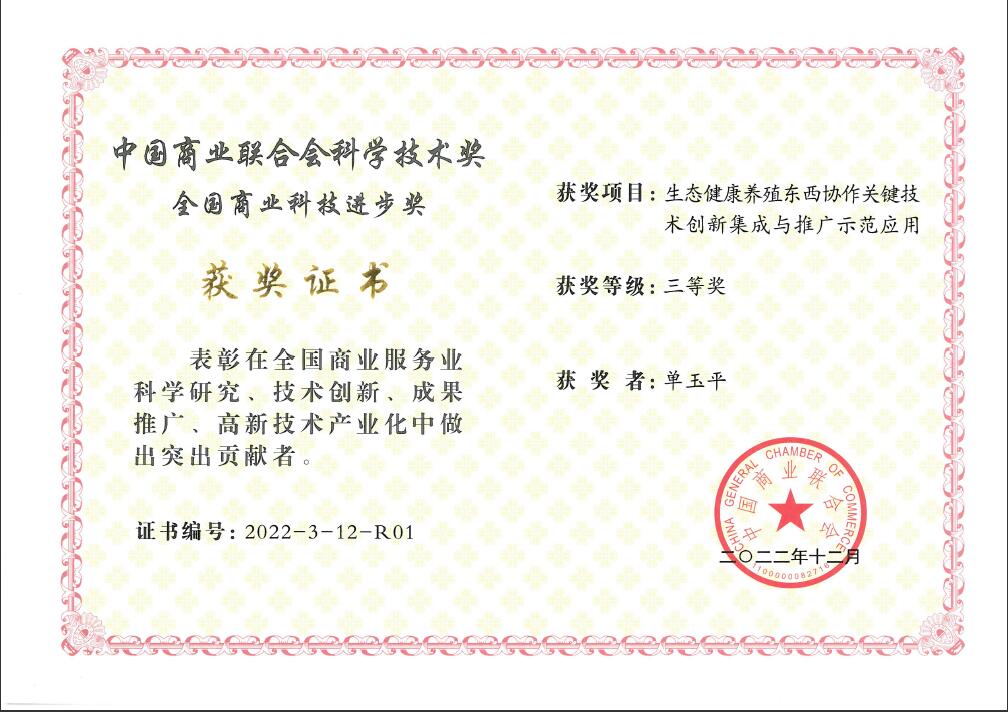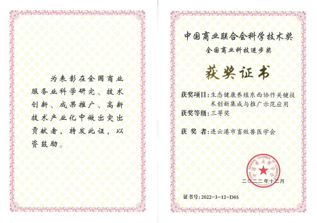7月30日,市畜牧兽医学会单玉平理事长应邀参加在北京召开的中国商业联合会主办的2023年全国商业科技质量大会,会上表彰了2022年度中国商业联合会科学技术奖获奖单位和个人,由连云港市畜牧兽医学会参与完成的科技成果《生态健康养殖东西协作关键技术创新集成与推广示范应用》获得2022年度全国商业科技进步三等奖。
