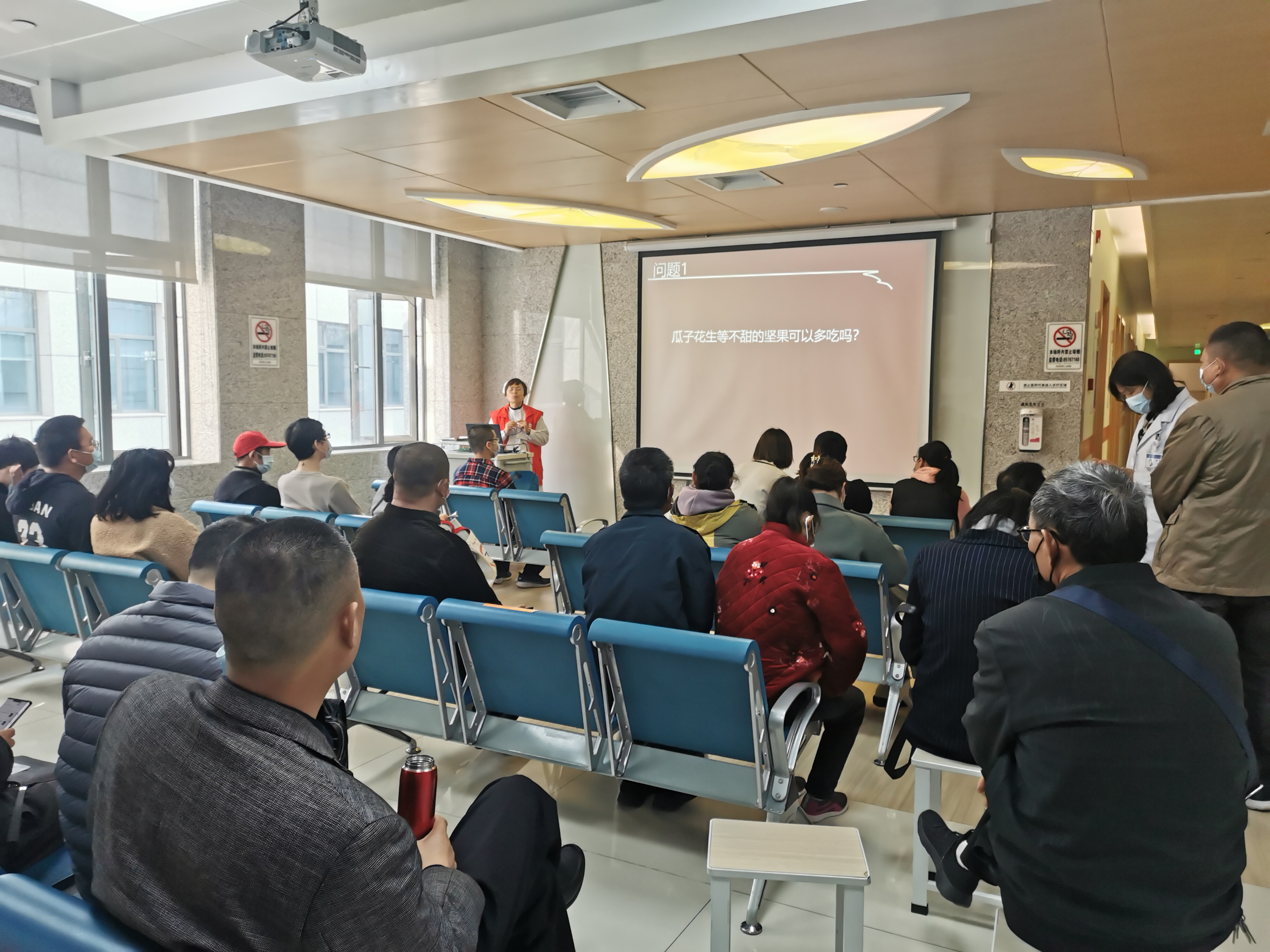 活动分成2个环节,第1环节在门诊大厅,免费为糖尿病患者,高危人群等监测血糖、糖化血红蛋白,大内科主任、内分泌科科主任徐宁主任根据患者的监测结果给予患者治疗方案的指导,糖尿病专科护士周丽询问患者糖尿病知识掌握情况,给予针对性指导,并发放糖尿病知识手册约100份。第2环节在1号楼2楼B1区,由内分泌科护士长、糖尿病专科护士杨正兄为患者及家属讲解糖尿病自我管理相关知识,确保患者在家可以正确的做好自我管理,更好的控制血糖、延缓并发症的发生、发展,收到患者欢迎。