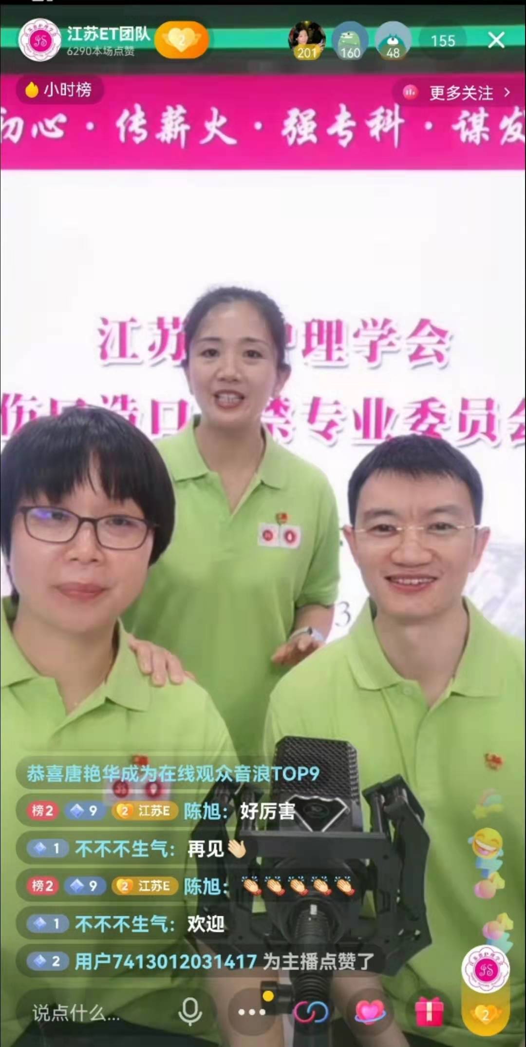 直播在朱守林主委娓娓道来的介绍中拉开序幕,连云港ET姐妹们带着各具特色的展示牌,介绍自己的门诊时间和服务宗旨。柳绿的沉着冷静和胸前玫红的会徽交辉相印,而鲜艳的党徽更是展示出ET姐妹们为人民服务的赤诚之心。