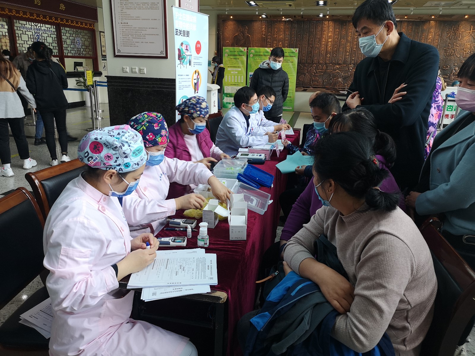 早上不到八点,市中医院1号楼门诊大厅人气火爆,内分泌专家们在这里举行大型义诊,前来咨询的人群络绎不绝,市糖尿病专委会主委包敏及专科护士们热情地为患者进行个体化监测血糖、血压、糖化血红蛋白,同时通过宣传单页、展板等形式进行糖尿病防治知识科普,活动共接待100余人,发放宣传资料150份。
