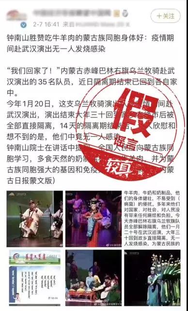 2月7日,某微博账号发布一条博文,主题为“钟南山盛赞吃牛羊肉的蒙古族同胞身体好:疫情期间赴武汉演出无一人发烧感染”,引发网友关注。