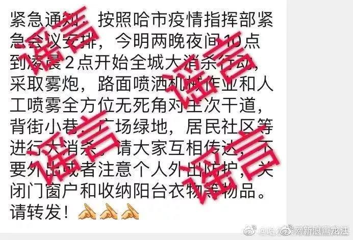 近日,在哈尔滨市民的微信群及微信朋友圈中大量传播一条信息:“紧急通知:按照哈市疫情指挥部紧急会议安排,今明两晚夜间10点到凌晨2点开始全城大消杀行动,采取雾炮,路面喷洒机械作业和人工喷雾全方位无死角对主次干道,背街小巷,广场绿地,居民社区等进行大消杀。请大家互相传达,不要外出或者注意个人外出防护,关闭门窗户和收纳阳台衣物等物品。请转发!”