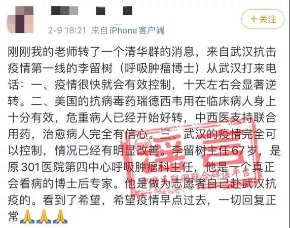 谣言五:疫情一线消息,李留树博士从武汉打来电话情一线消息,李留树博士从武汉打来电话