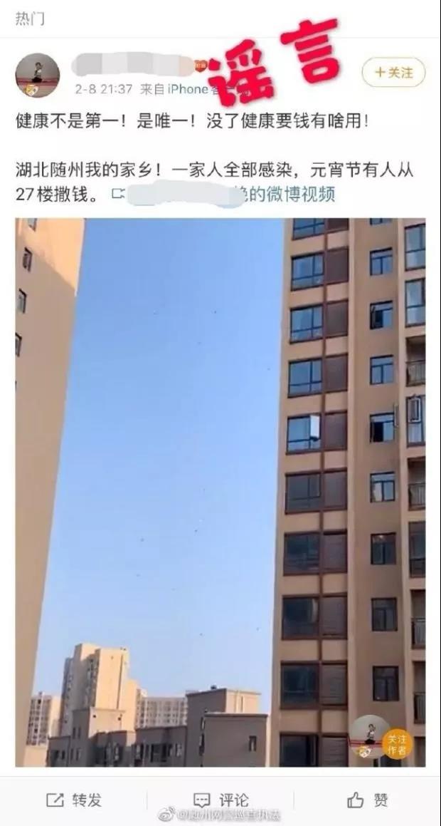 近日,一则关于“一家人全部感染,元宵节从27楼撒钱”的短视频在朋友圈流传,不少网友信以为真。2月9日,该视频被郑州的不少网友转发,称此事发生在郑州某小区。搜索发现,该视频几日前也曾以同样形式出现在湖北随州市民的朋友圈里。