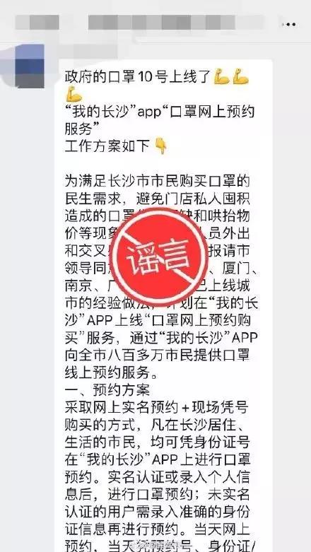 该消息不属实。这是一则看似较为“完善”的服务方案,打着长沙市政府的旗号,把预约规则、操作步骤、责任分工等说得清清楚楚,让不少网友信以为真。经了解,“我的长沙”APP上并未公布该方案,也没有相关预约入口, 通过致电12345长沙市民服务热线获悉,长沙市政府并未出台相关方案,“我的长沙”APP也从未接到任何口罩预约服务的有关通知。