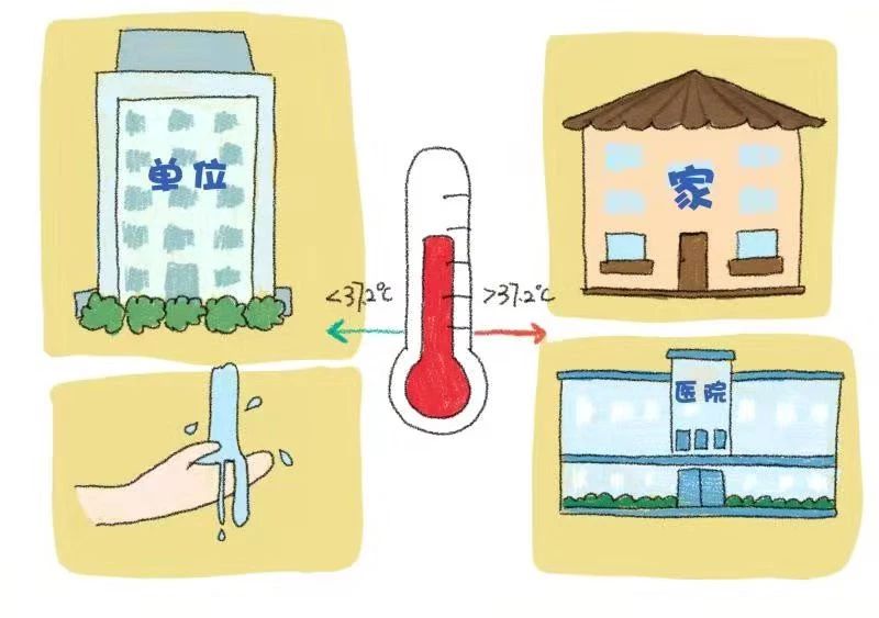 进入办公楼前自觉接受体温检测,体温正常可入楼工作,并到卫生间洗手。若体温超过37.2℃,请勿入楼工作,并回家观察休息,必要时到医院就诊。
