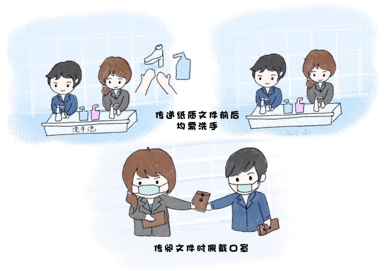 传递纸质文件前后均需洗手,传阅文件时佩戴口罩。